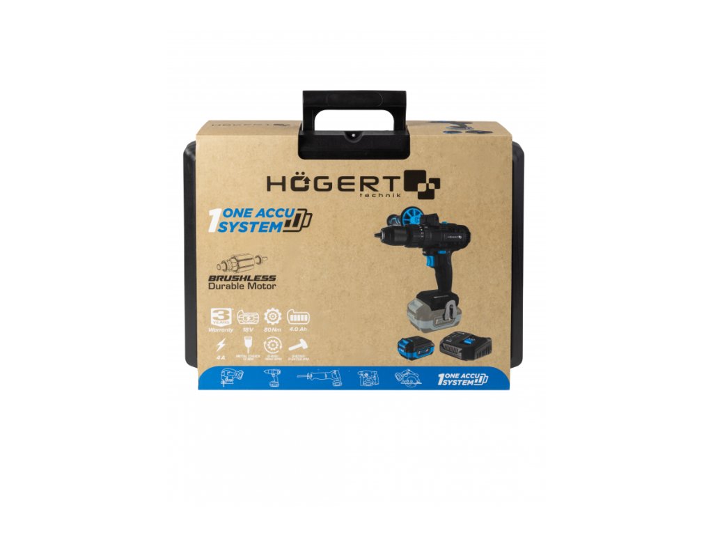 HT2E223-0PD: Efektivní, snadná a rychlá vrtačka pro vrtání do cihel, kamene, dřeva, kovu a plastů, jakož i pro šroubování a vyšroubování. Vrtací sklíčidlo 13mm a točivý moment 80 Nm umožňují použití větších vrtáků, takže je nářadí univerzálnější pro širokou škálu aplikací, a to i těch nejnáročnějších. Dvourychlostní převodovka a nastavení točivého momentu 21+1 vám umožní flexibilně přizpůsobit chod elektrického nářadí materiálu a úkolu. Plynulá regulace otáček na spínači vám dává plnou kontrolu nad vrtáním a šroubováním. Přepínání otáčení elektrického nářadí v obou směrech umožňuje vrtání, šroubování a vyšroubování. Měkká rukojeť umožňuje bezpečnější uchopení elektrického nářadí a tlumí vibrace při práci. Vestavěná výkonná svítilna LED dokonale osvětluje pracoviště Držák na 6 bitů, který organizuje použité příslušenství. Bezkartáčový motor s inovativní konstrukcí díky eliminaci tření kartáčů a speciálním magnetům poskytuje vyšší výkon, delší dobu chodu a delší životnost elektrického nářadí. Pokročilá elektronika neustále reguluje motor a optimalizuje jeho výkon podle prováděné činnosti, což vede k efektivnímu provozu a maximalizaci životnosti baterie. Motor je chráněn proti vniknutí prachu, kovových částic a zadření. Robustní kovový kryt převodovky dokonale odvádí teplo, takže jednotka pracuje efektivněji a vydrží déle v provozu. Kovová převodovka zvyšuje odolnost proti opotřebení a zajišťuje přesnost mechanismu. Tepelná ochrana, chrání jednotku před přehřátím během provozu. Gumové nárazníky chrání jednotku před mechanickým poškozením. Systém OneAccuSystem 18V umožňuje použití vybraného akumulátoru v širokém a rozmanitém spektru elektrického nářadí pro nejnáročnější práce. HT2E242-C60: Účinná nabíječka, která nabije baterii o kapacitě 2 Ah za pouhých cca 30 min. Pokročilý elektronický modul monitoruje napětí a teplotu baterie, aby se maximalizovala účinnost nabíjecího procesu a zajistila dlouhá životnost baterie. Ochrana proti přehřátí prodlužuje životnost a výdrž baterie. Proudová ochrana proti zkratu zvyšuje bezpečnost procesu nabíjení. Sledování úrovně nabití článků prodlužuje jejich životnost. Indikátory zobrazují stav baterie a proces nabíjení. HT2E240-A40: Perfektně vyvážená baterie s nízkou hmotností, malými rozměry a kapacitou pro mnoho různých zařízení v nabídce značky. Pokročilý elektronický modul monitoruje provoz baterie pro dosažení maximálního výkonu, doby provozu, zvýšené odolnosti a bezpečnosti. Ochrana článků proti přehřátí prodlužuje jejich provozní dobu a zvyšuje jejich životnost. Proudová ochrana proti zkratu zvyšuje bezpečnost provozu a skladování baterie. Monitorování úrovně nabití článků prodlužuje jejich životnost. Články vyrobené nejnovější lithium-iontovou (Li-Ion) technologií zajišťují vysokou energetickou účinnost, odolnost a spolehlivost. Kryt chráněný pryžovými nárazníky chrání před mechanickým poškozením. Ochrana článků před vlhkostí. Možnost provozu od -18 ℃ vnější provozní teploty, rozšiřuje rozsah použití nástroje. Indikátor stavu nabití zobrazuje zbývající dostupnou energii.