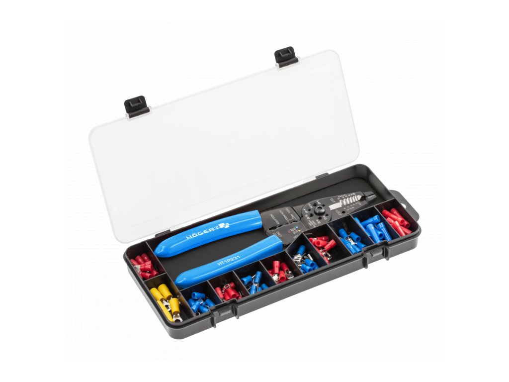Krimpovací kleště na elektrické konektory se sadou 86 konektorů, v praktickém plastovém obalu. Jsou určeny k použití v elektronice, k provádění elektroinstalačních, telekomunikačních a dalších montážních prací.