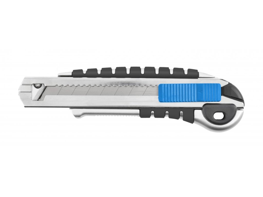 Nůž s lámací čepelí 18 mm, na univerzální použití, užitečný při dokončovacích pracích. Určený hlavně pro řezání kartonu, tapet, koberců, plachtovin, tiskových fólií, PVC fólií atd.